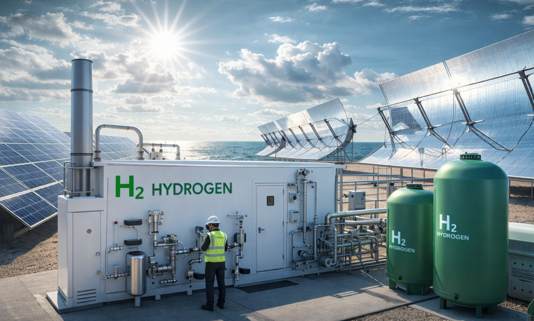 Renewable electricity electrolyses water into hydrogen — a scalable, carbon-free energy carrier for industries, transport and infrastructure.